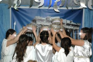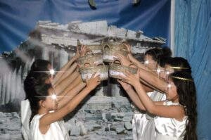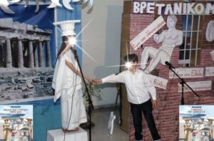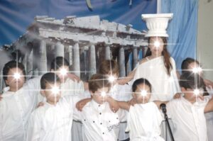 The school theatrical adaptation of “I Was born in Greece” moved the audience with its dramatic depiction of the return of the Parthenon Sculptures. The stage was flooded with light as the Caryatid, dressed in white, stood marble-like and expressionless. Zisis approached, holding an olive branch, a gift from her sisters, full of hope. “This is for you,” he said, and the Caryatid gazed at the branch with tears in her eyes. The children sang a nostalgic hymn, while the Caryatids united, forming a circle. “I was born in Greece” the Caryatid whispered, and the curtain fell. Bravo!!!